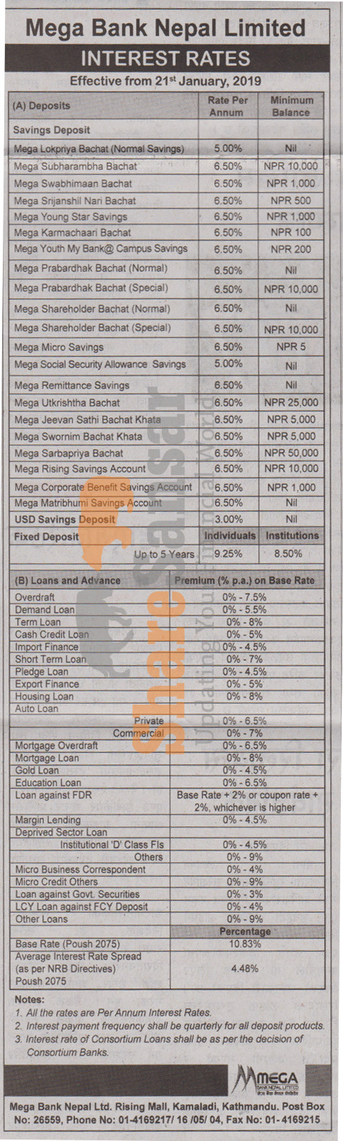 Mega Bank Nepal Limited has published a notice regarding new interest rate and its effective from 7th Magh, 2075.
