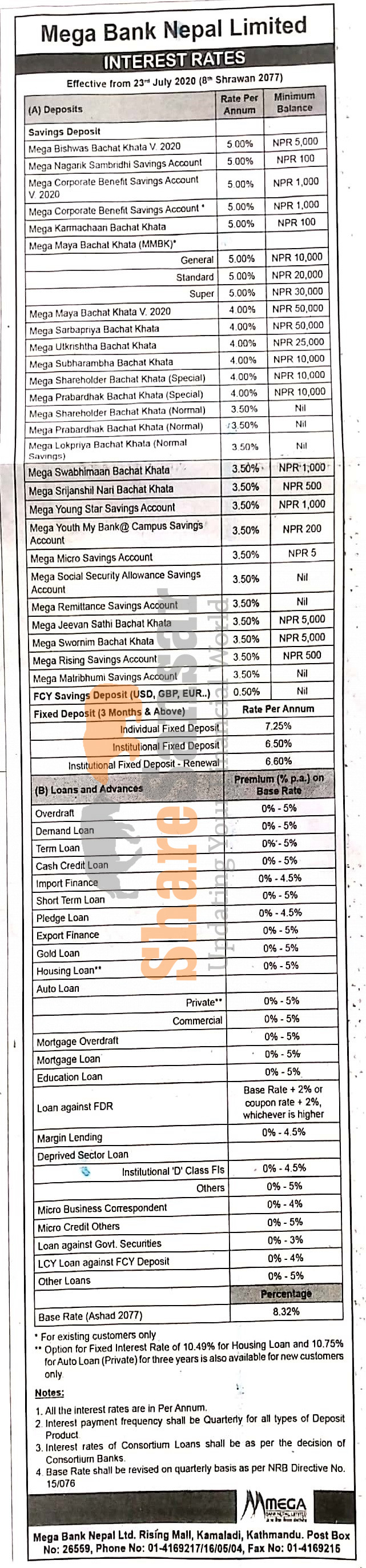 Mega Bank Nepal Limited has published a notice regarding the interest rate on the various deposit and loan products and its effective from 8th Shrawan, 2077.