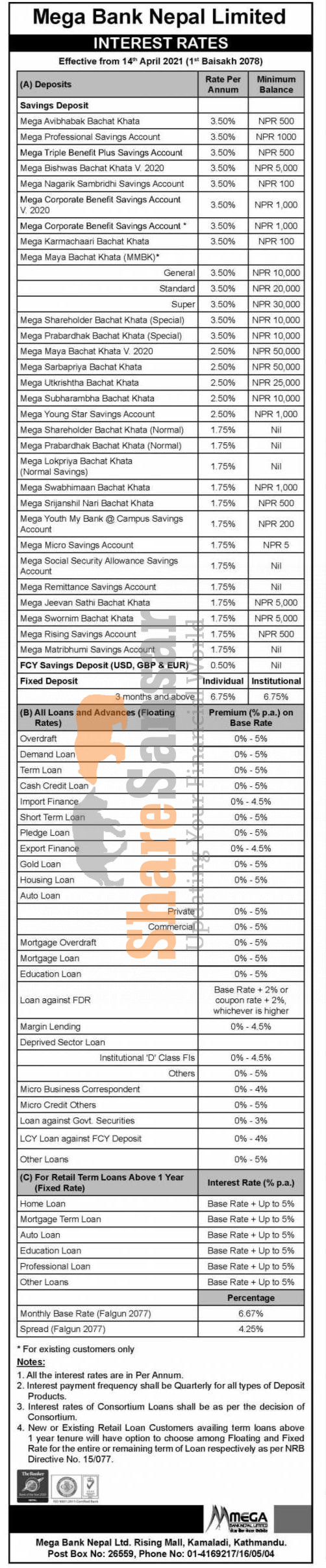 Mega Bank Nepal Limited has published a notice regarding the new interest rate for deposit and loan products and it's effective from 1st Baisakh, 2078.