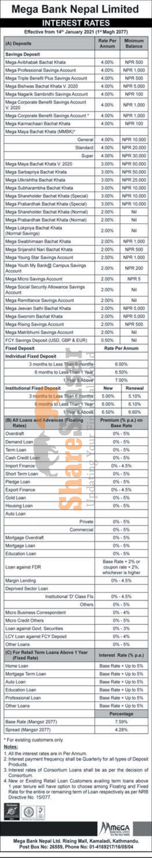 Mega Bank Nepal Limited has published a notice regarding the new interest rate for deposit and loan products and it's effective from 1st Magh, 2077.