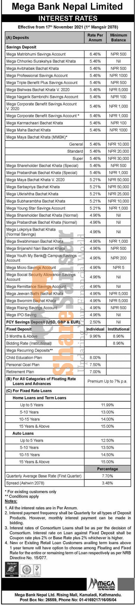 Mega Bank Nepal Limited has published a notice regarding the new interest rate for deposit and loan products and it's effective from 1st Mangsir, 2078.