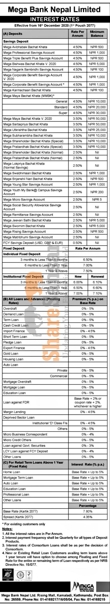 Mega Bank Nepal Limited has published a notice regarding the new interest rate for its deposit and loan products and it's effective from 1st Poush, 2077.