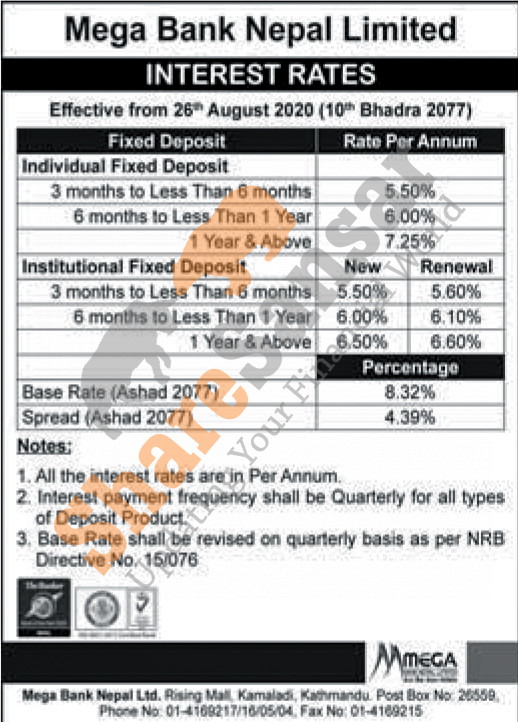Mega Bank Nepal Limited has published a notice regarding the new interest rate for its deposit products and its effective from 10th Bhadra, 2077.