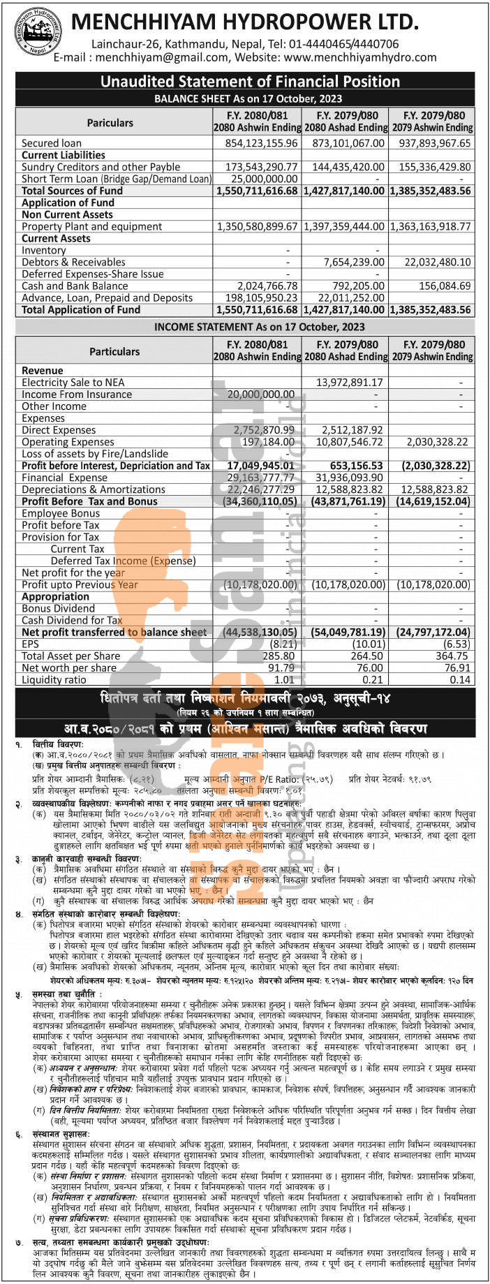 Menchhiyam Hydropower Limited has posted a net loss of Rs 34.36 million and published its 1st quarter company analysis of the fiscal year 2080/81.
