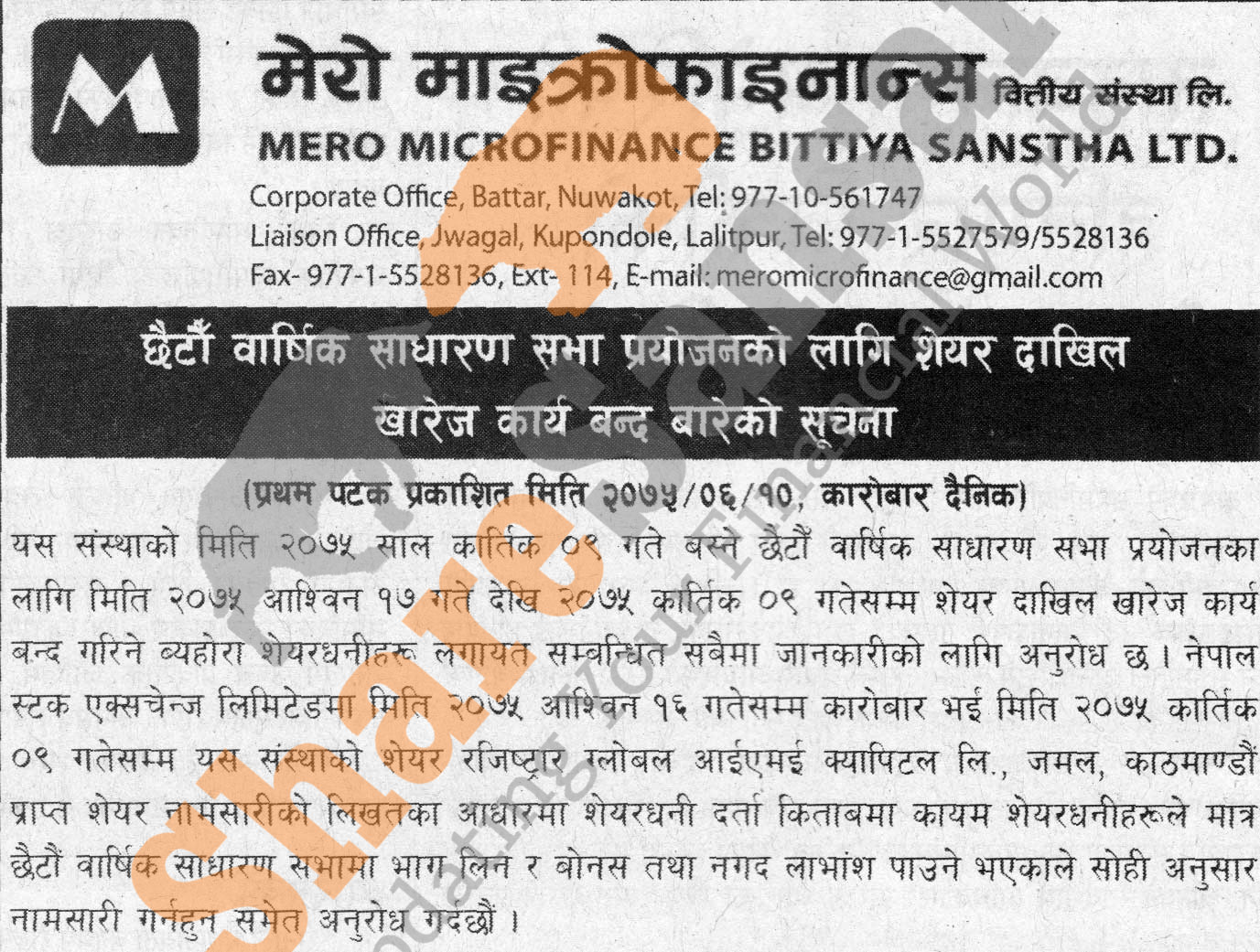 Mero Microfinance Bittiya Sanstha Limited has published a book closure date for its 6th AGM on (17th Ashwin, 2075).