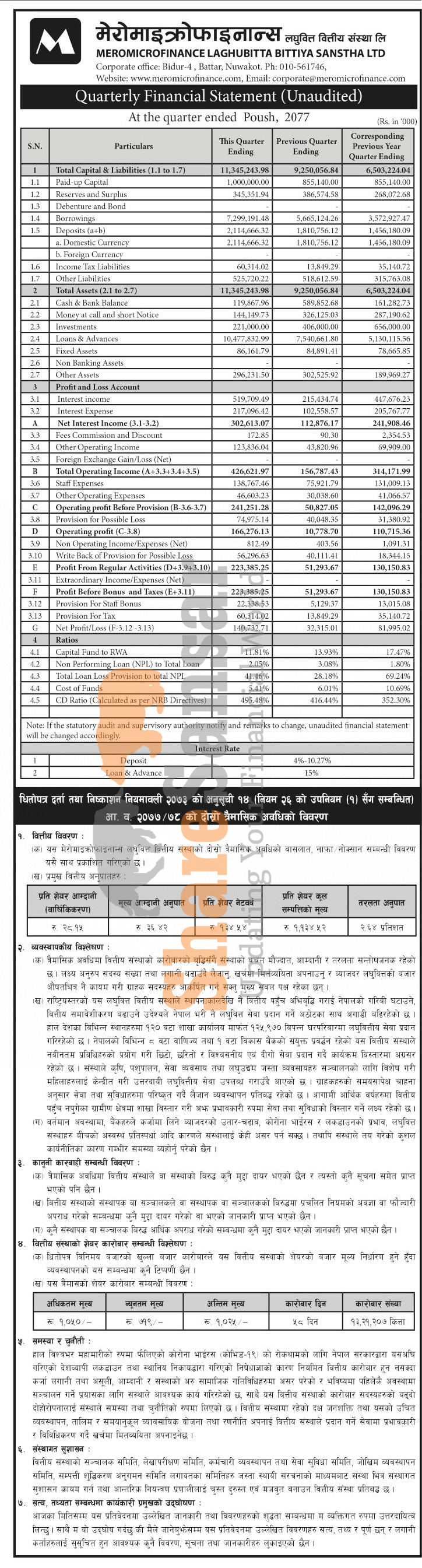 Mero Microfinance Laghubitta Bittiya Sanstha Limited has posted a net profit of Rs 140.73 million and published its 2nd quarter company analysis of the fiscal year 2077/78.