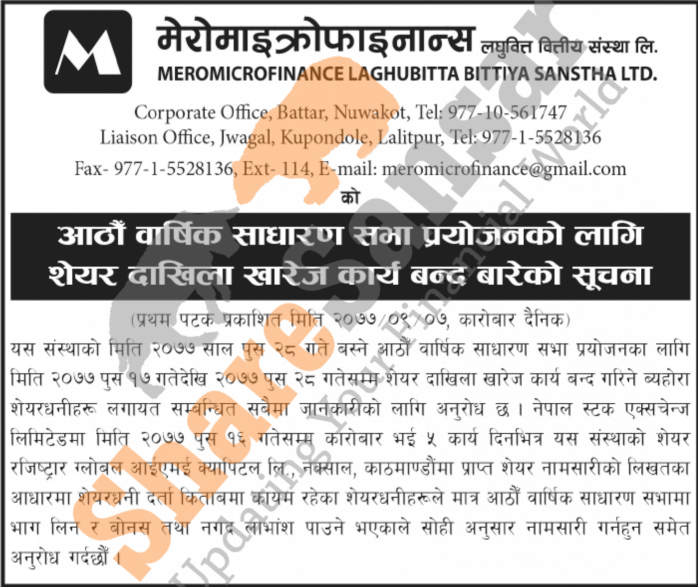 Mero Microfinance Laghubitta Bittiya Sanstha Limited has published a book closure date for its 8th AGM on (17th Poush, 2077).
