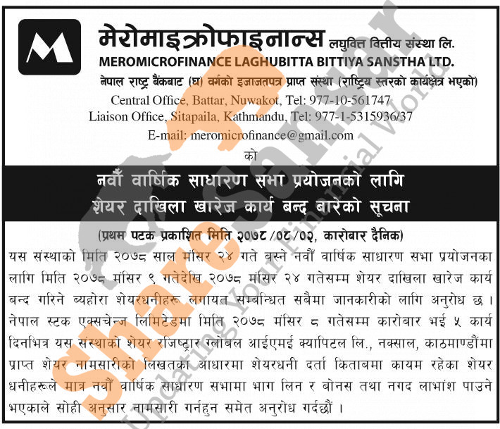 Mero Microfinance Laghubitta Bittiya Sanstha Limited has published a book closure date for its 9th AGM on 9th Mangsir, 2078.