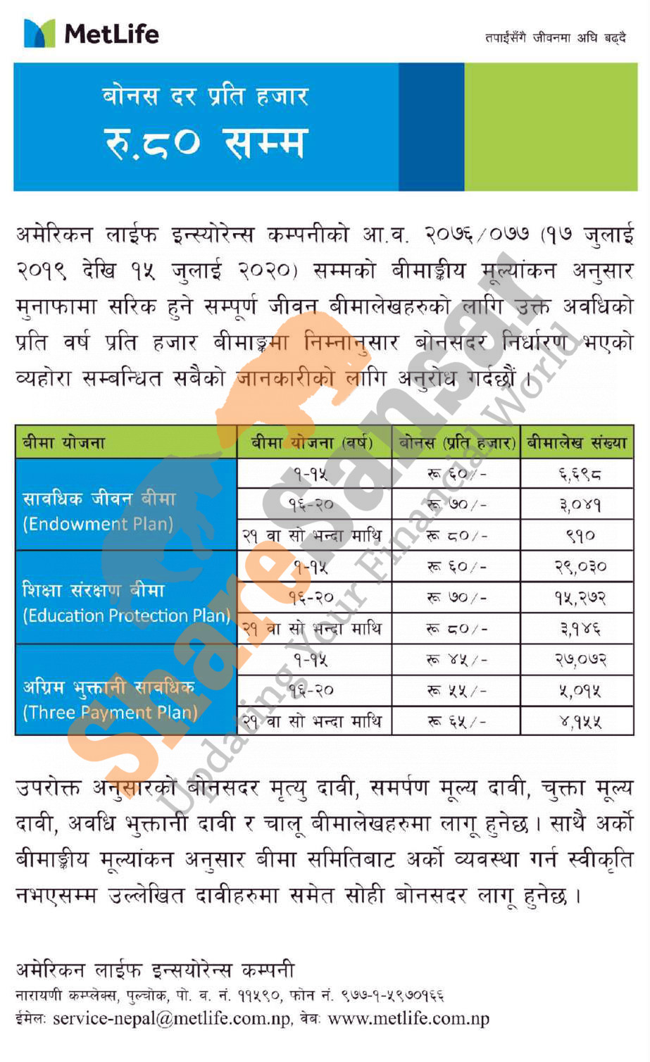 Metlife - American Insurance Company Limited has published a notice regarding a new bonus rate for its different life insurance policies.