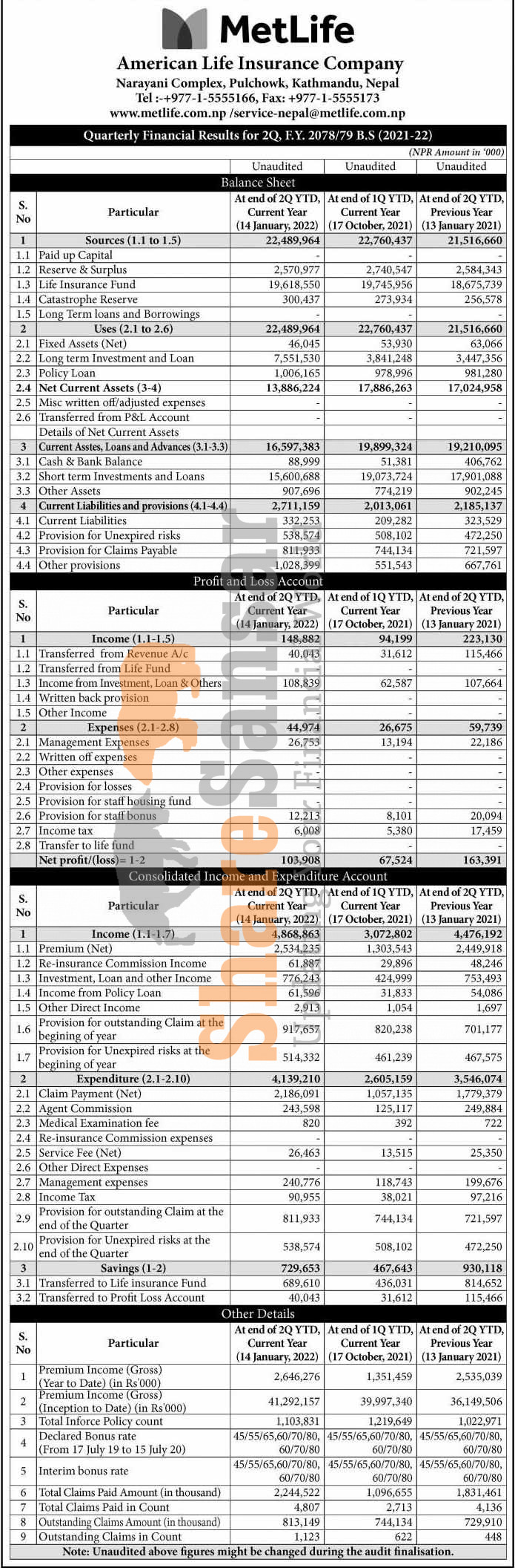Metlife - American Life Insurance Company Limited has posted a net profit of Rs 103.90 million and published its 2nd quarter company analysis of the fiscal year 2078/79.