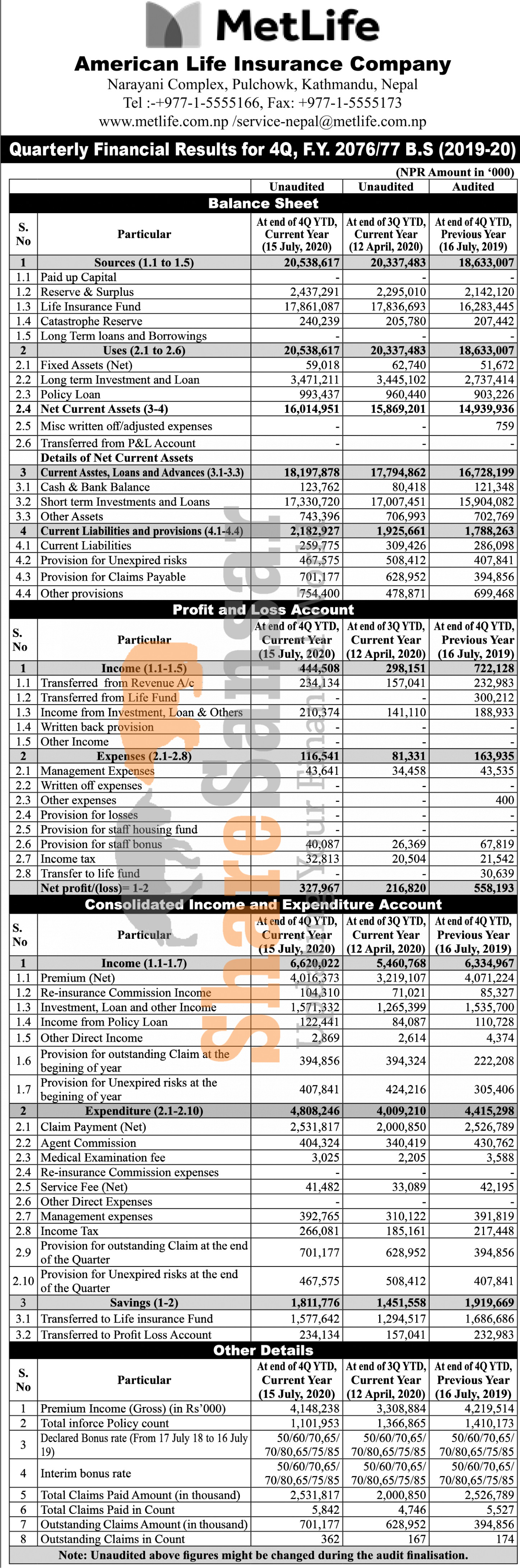 Metlife American Life Insurance Company Limited has posted a net profit of Rs 327.96 million during the 4th quarter of the fiscal year 2076/77.
