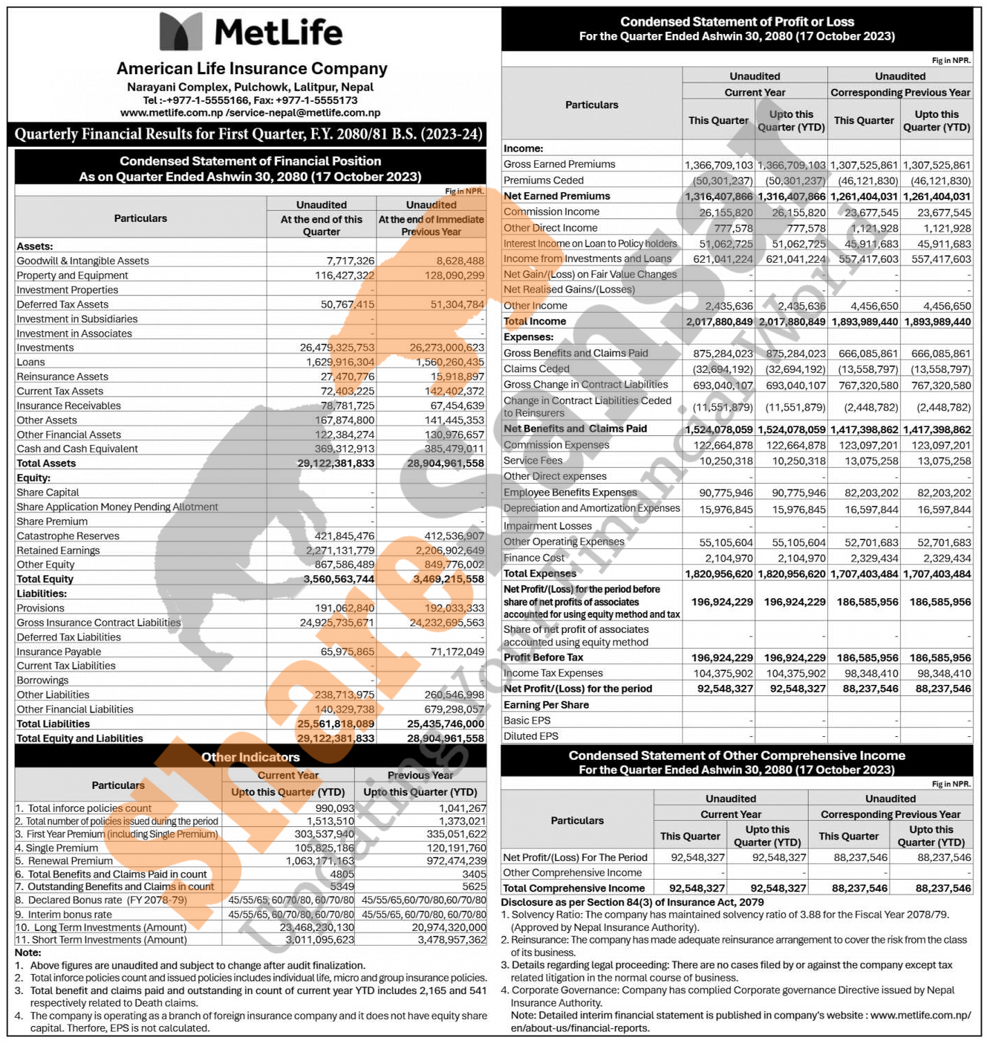 Metlife - American Life Insurance Company Limited has posted a net profit of Rs 92.54 million during the 1st quarter of the fiscal year 2080/81.