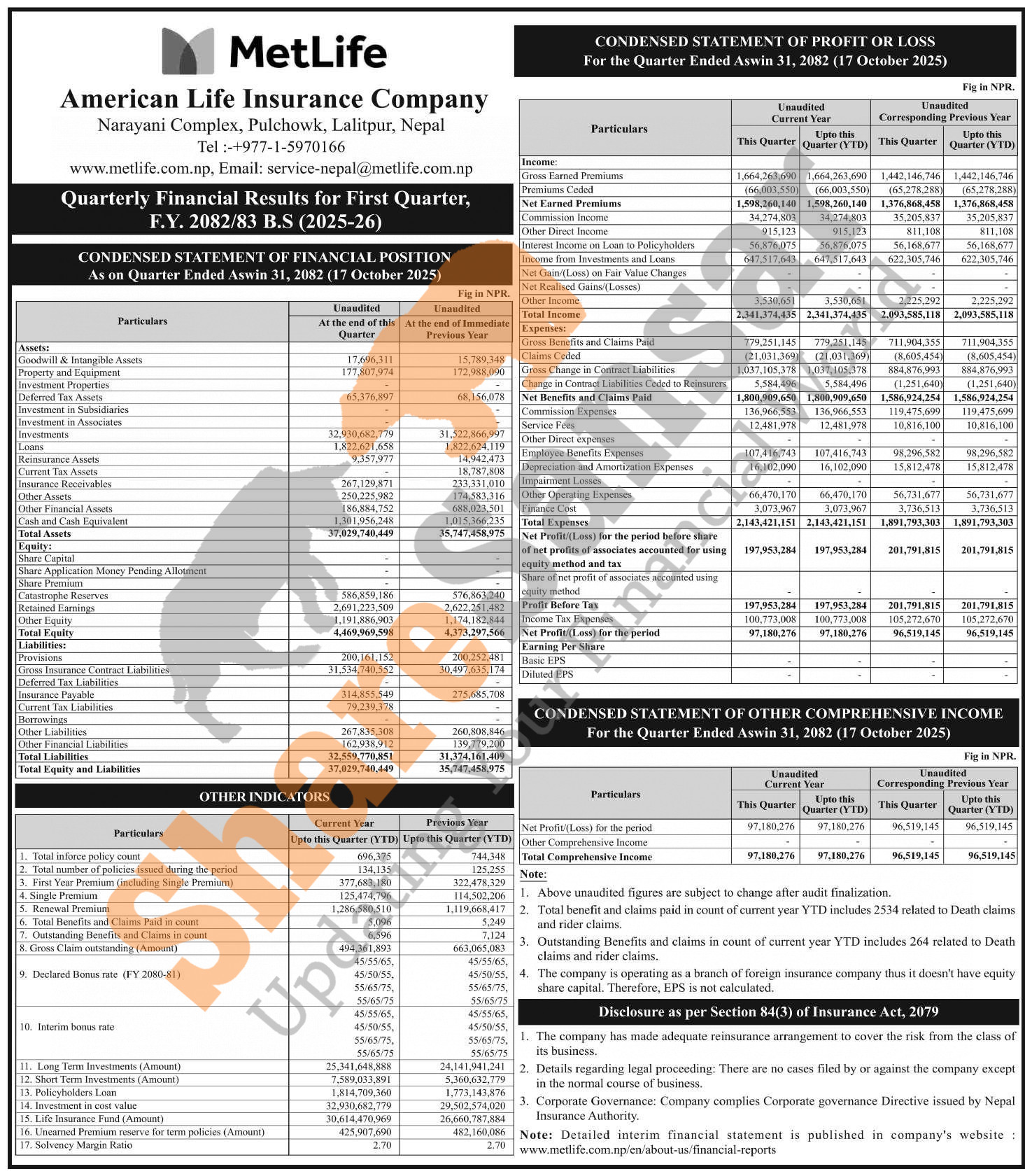 Metlife - American Life Insurance Company Limited has posted a net profit of Rs 97.18 million and published its 1st quarter company analysis of the fiscal year 2082/83.