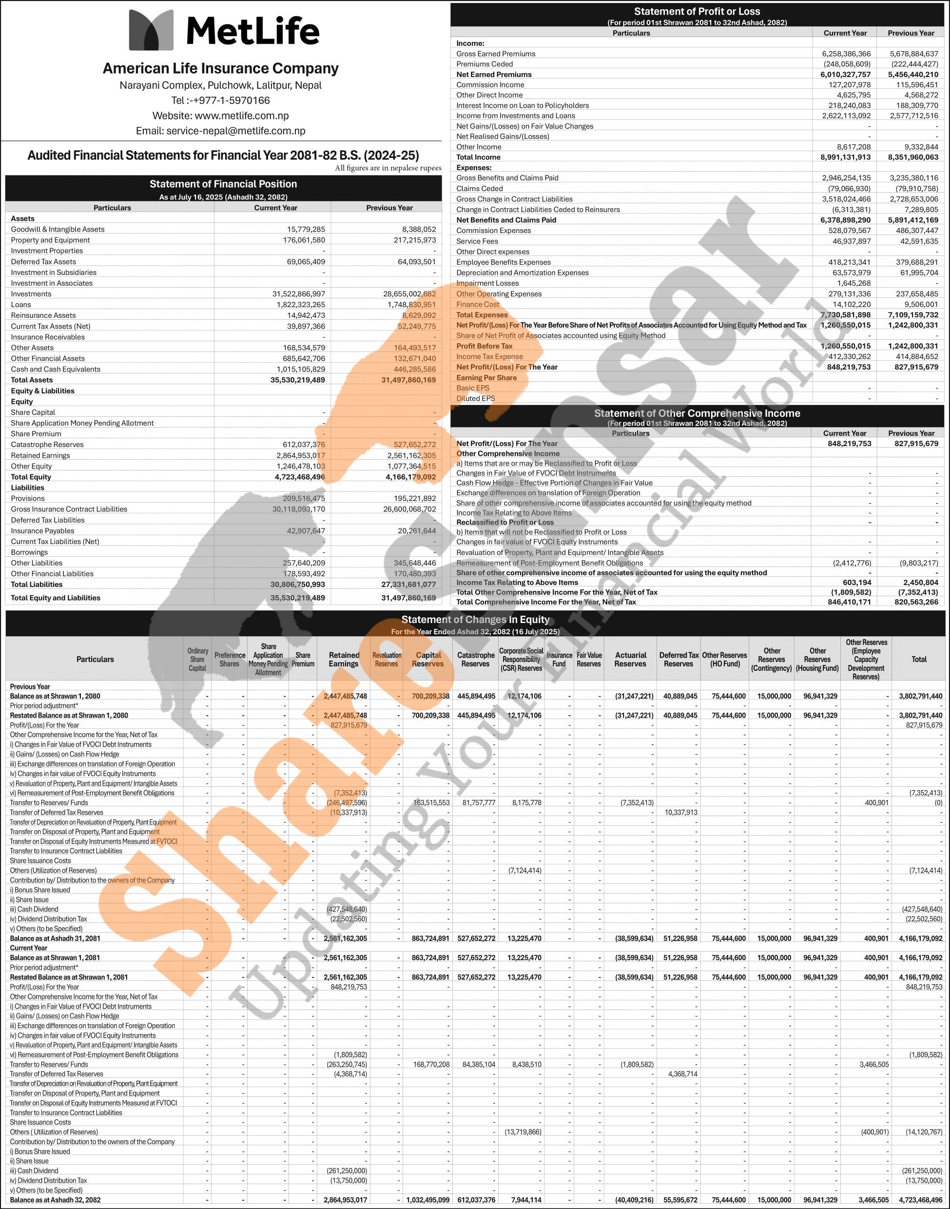 Metlife - American Life Insurance Company Limited has published its annual financial statement of the fiscal year 2081/82.