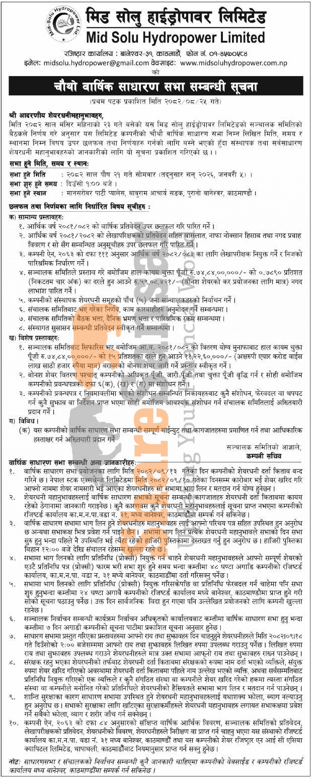 Mid Solu Hydropower Company Limited has announced its 4th AGM going to be held on 21st Poush, 2082.