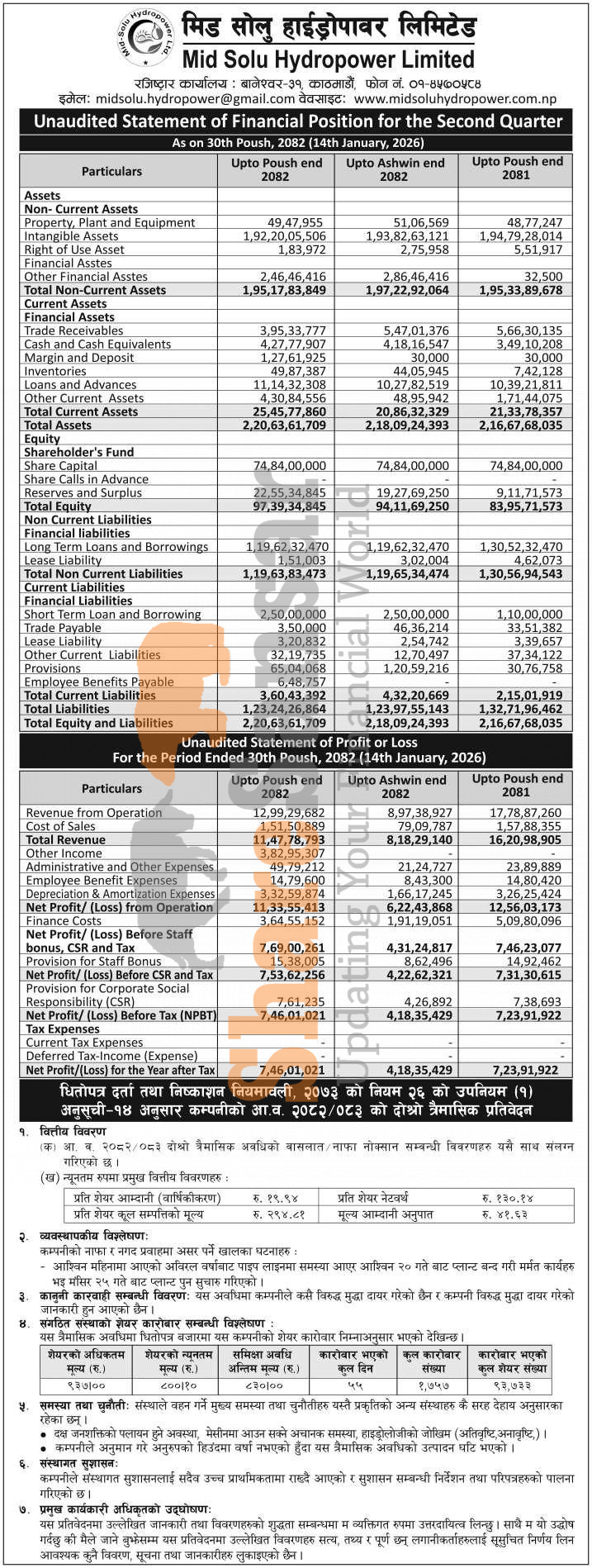 Mid Solu Hydropower Company Limited has posted a net profit of Rs 74.60 million and published its 2nd quarter company analysis of the fiscal year 2082/83.