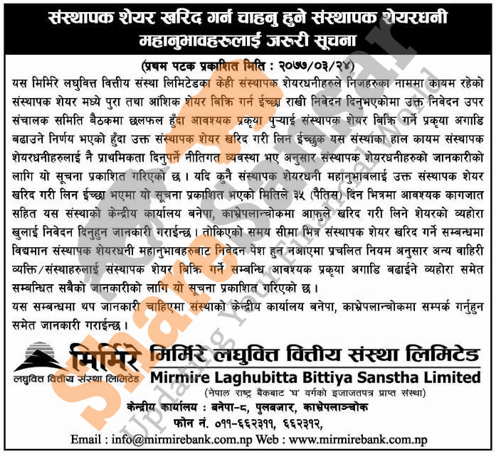Mirmire Laghubitta Bittiya Sanstha Limited has published a notice regarding selling its promoter shares.