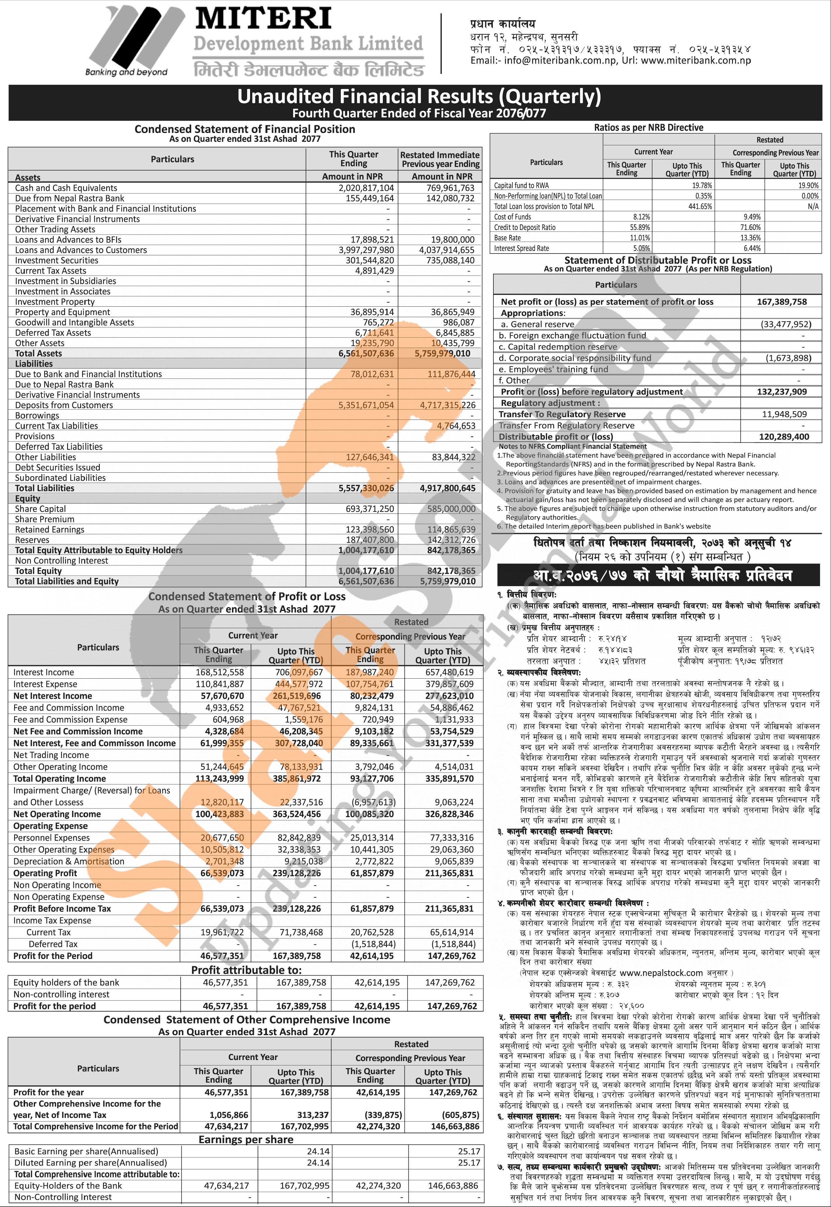 Miteri Development Bank Limited has posted a net profit of Rs 167.38 million and published its 4th quarter company analysis of the fiscal year 2076/77.