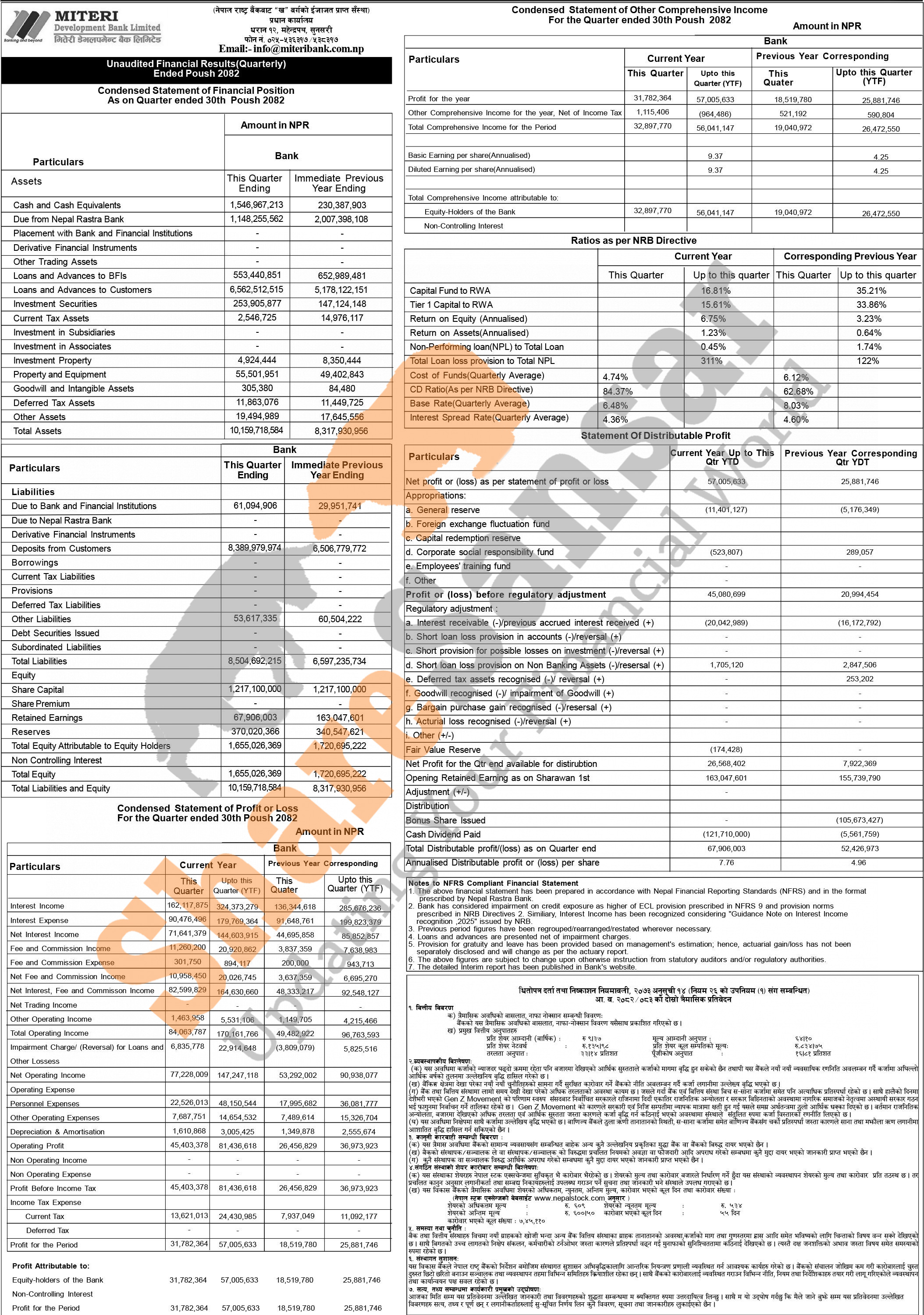 Miteri Development Bank Limited has posted a net profit of Rs 57 million and published its 2nd quarter company analysis of the fiscal year 2082/83.