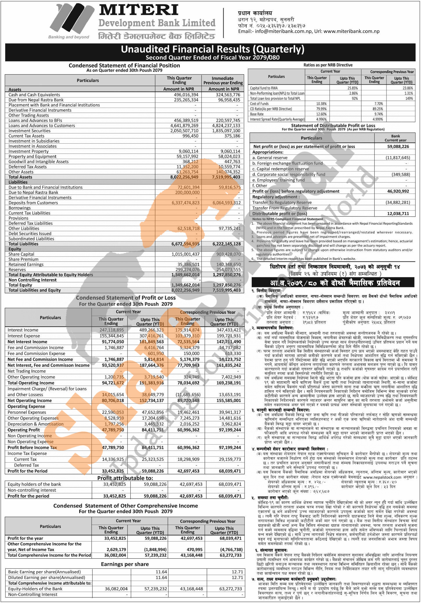 Miteri Development Bank Limited has posted a net profit of Rs 59.08 million and published its 2nd quarter company analysis of the fiscal year 2079/80.