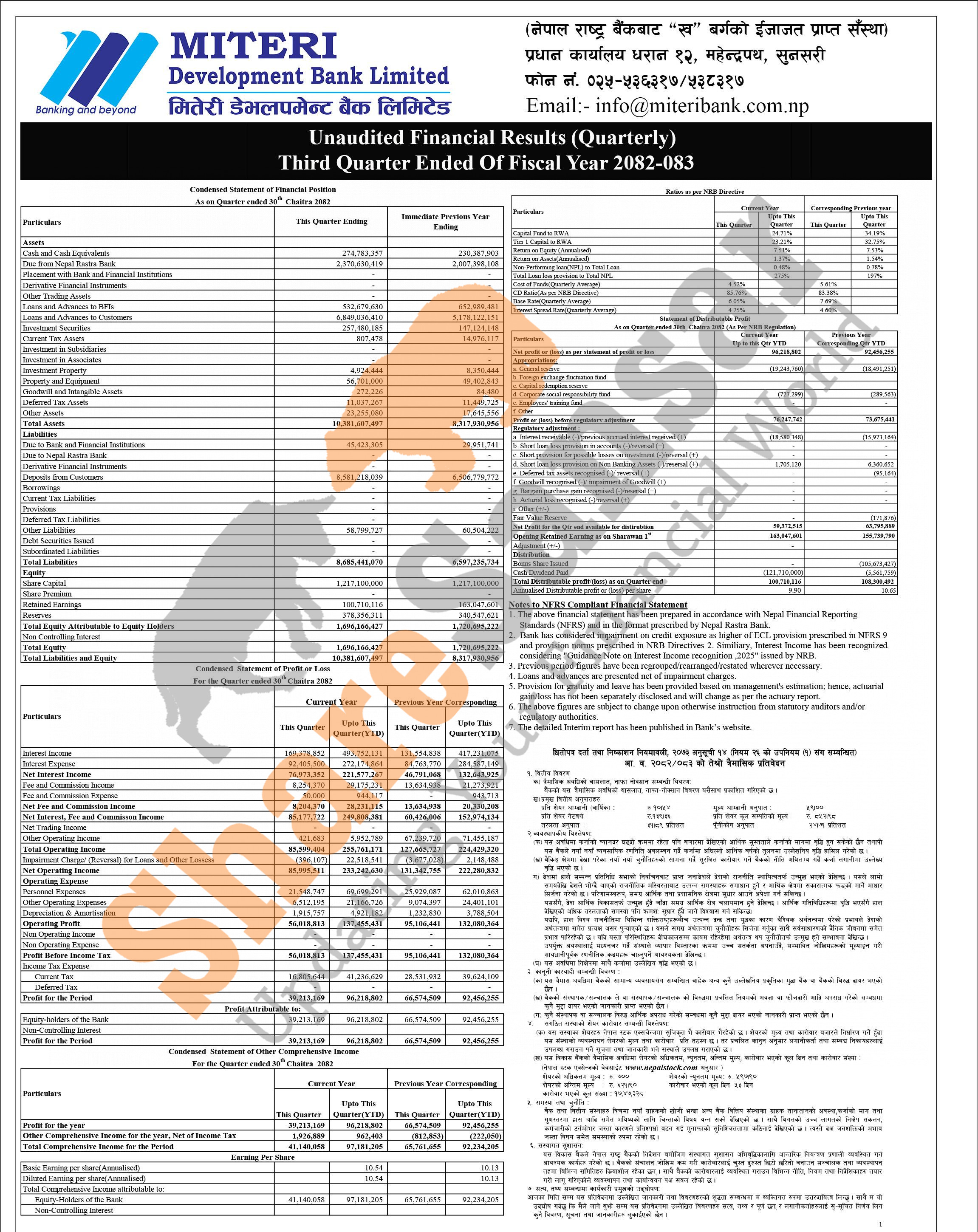 Miteri Development Bank Limited has posted a net profit of Rs 96.21 million and published its 3rd quarter company analysis of the fiscal year 2082/83.