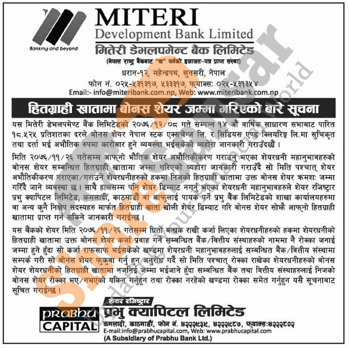 Miteri Development Bank Limited is distributing 18.525% bonus shares directly to Demat accounts of its shareholders.
