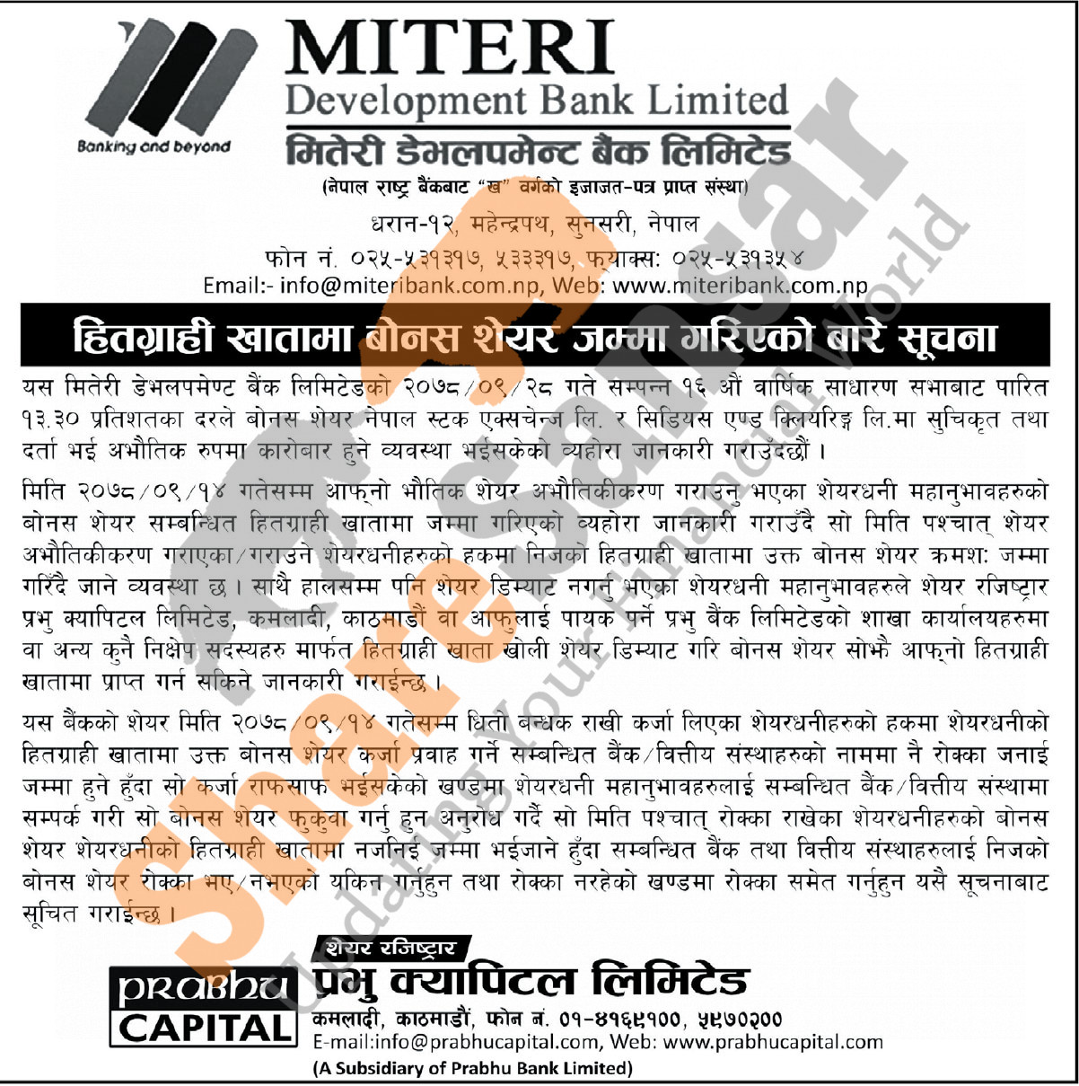 Miteri Development Limited has distributed 13.30% bonus share directly to DEMAT accounts and urged its shareholders to dematerialize their shares.