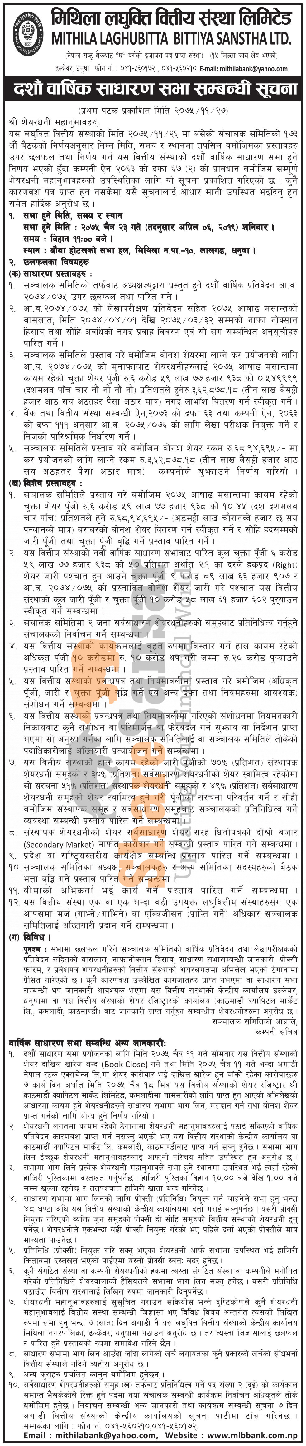 Mithila Laghubitta Bittiya Sanstha Limited has announced its 10th AGM going to be held on 23rd Chaitra, 2075.