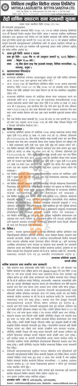 Mithila Laghubitta Bittiya Sanstha Limited has announced its 13th AGM going to be held on 29th Poush, 2078.