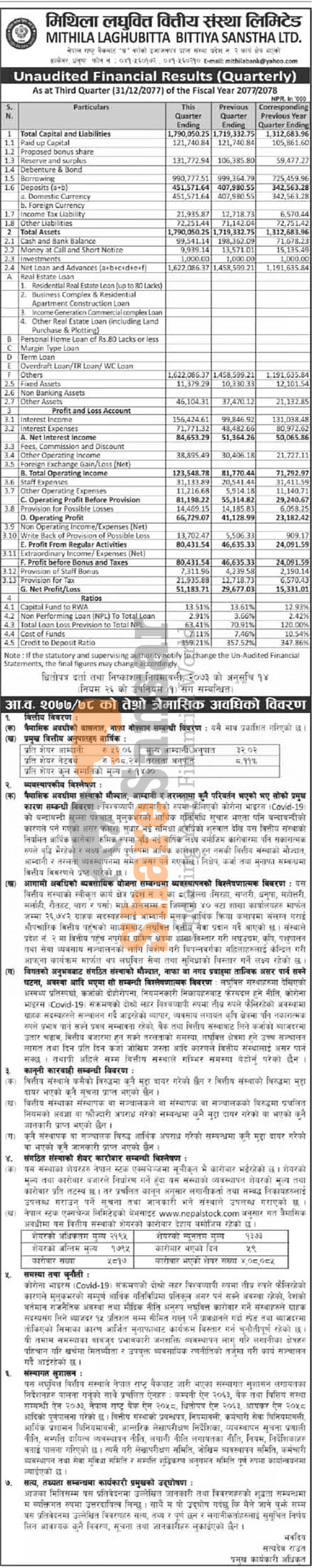 Mithila Laghubitta Bittiya Sanstha Limited has posted a net profit of Rs 51.18 million and published its 3rd quarter company analysis of the fiscal year 2077/78.