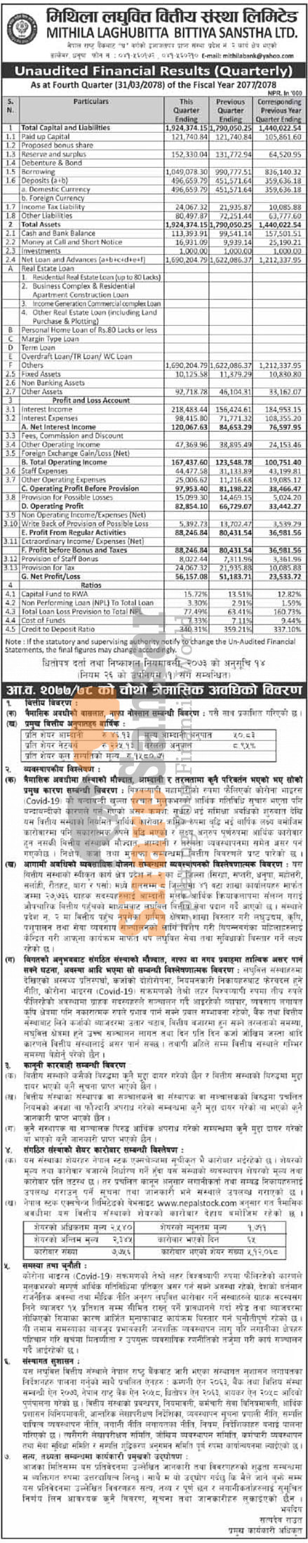 Mithila Laghubitta Bittiya Sanstha Limited has posted a net profit of Rs 56.15 million and published its 4th quarter company analysis of the fiscal year 2077/78.