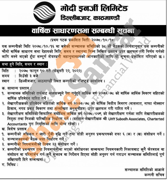 Modi Energy Limited has announced its 4th AGM going to be held on 10th Falgun, 2078.