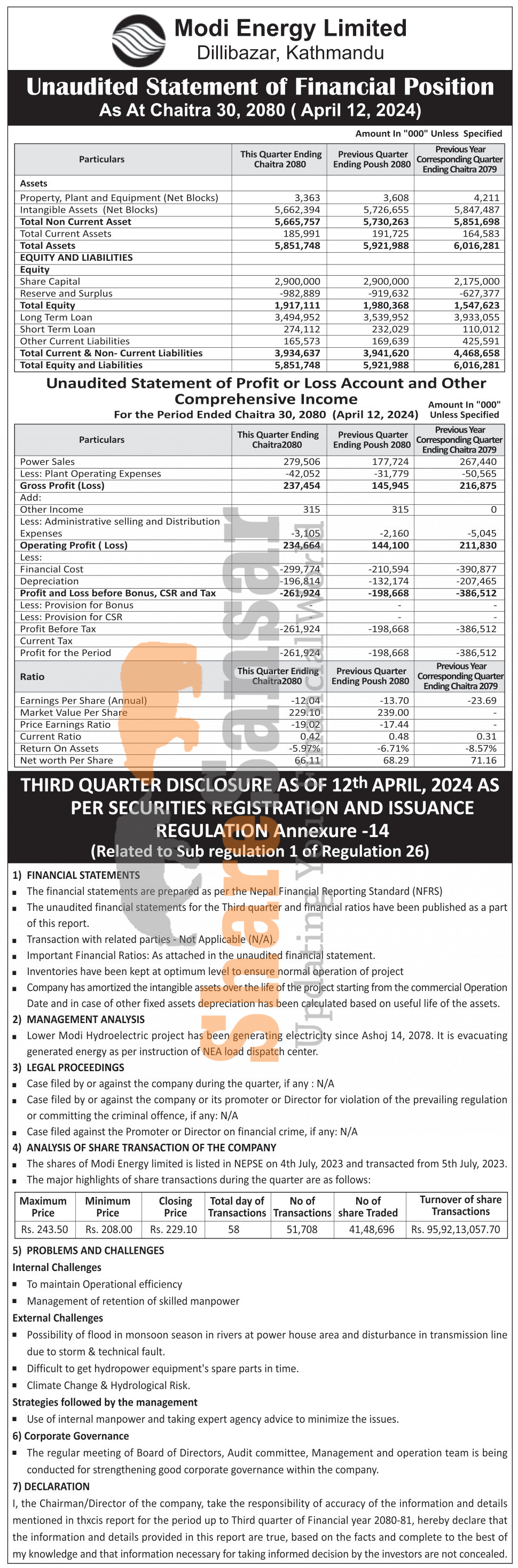 Modi Energy Limited has posted a net loss of Rs 261.92 million and published its 3rd quarter company analysis of the fiscal year 2080/81.