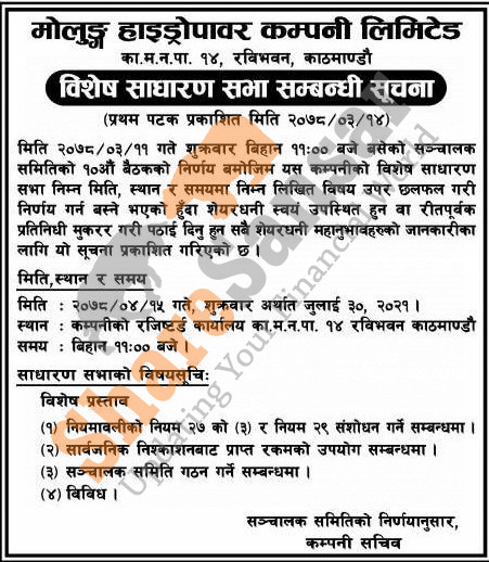 Molung Hydropower Company Limited has announced its SGM going to be held on 15th Shrawan, 2078.