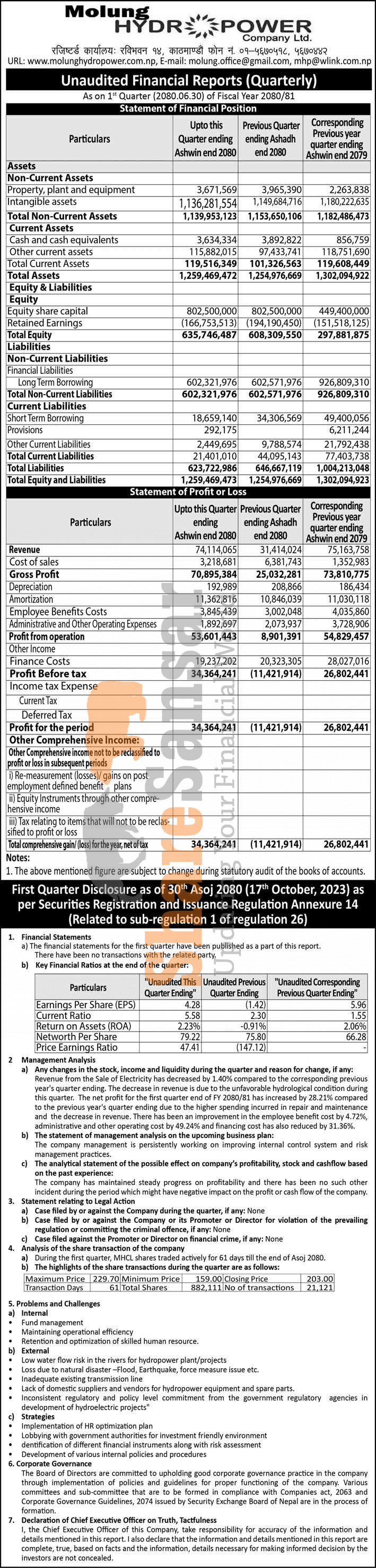 Molung Hydropower Company Limited has posted a net profit of Rs 34.36 million and published its 1st quarter company analysis of the fiscal year 2080/81.
