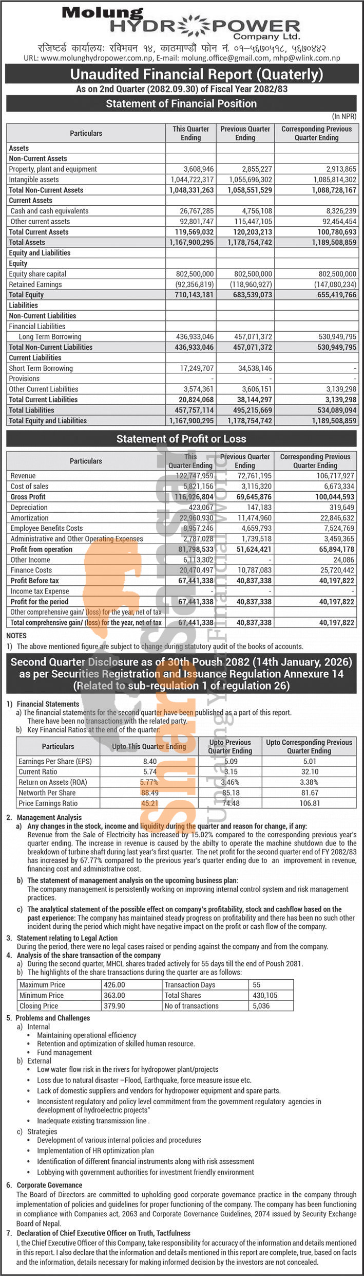 Molung Hydropower Company Limited has posted a net profit of Rs 67.44 million and published its 2nd quarter company analysis of the fiscal year 2082/83.