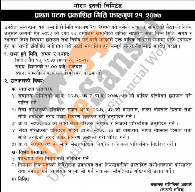 Morang Energy Limited has announced its Annual General Meeting going to be held on 13th Chaitra, 2077.