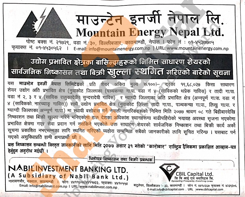 Mountain Energy Nepal Limited has cancelled its IPO issue due to ongoing natural calamities in the different parts of the country.
