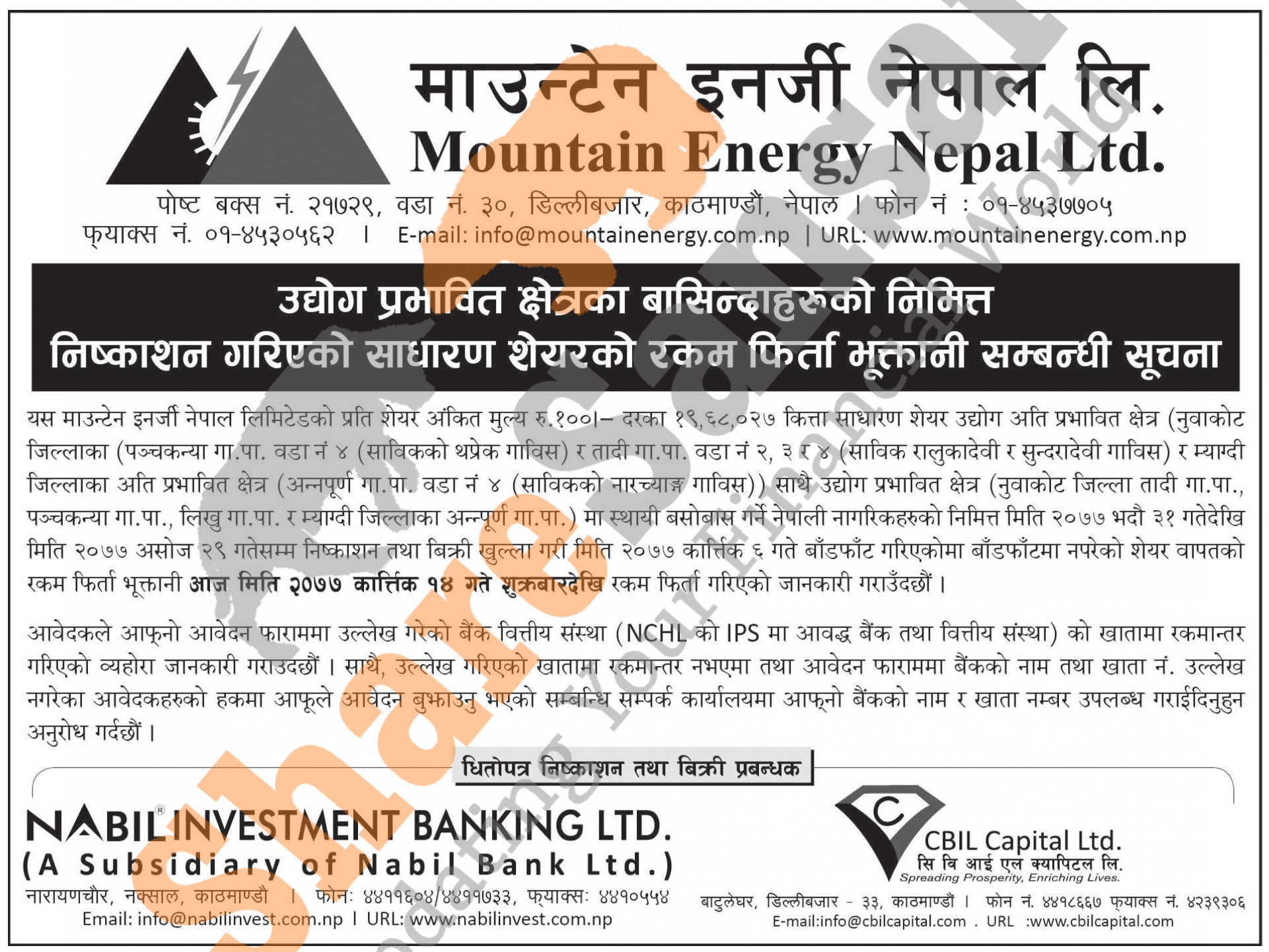 Mountain Energy Nepal Limited is refunding the amount to the non-allottee of 19,68,020 units IPO shares issue to the project-affected locals' residents of Nuwakot and Myagdi District from 14th Kartik, 2077.