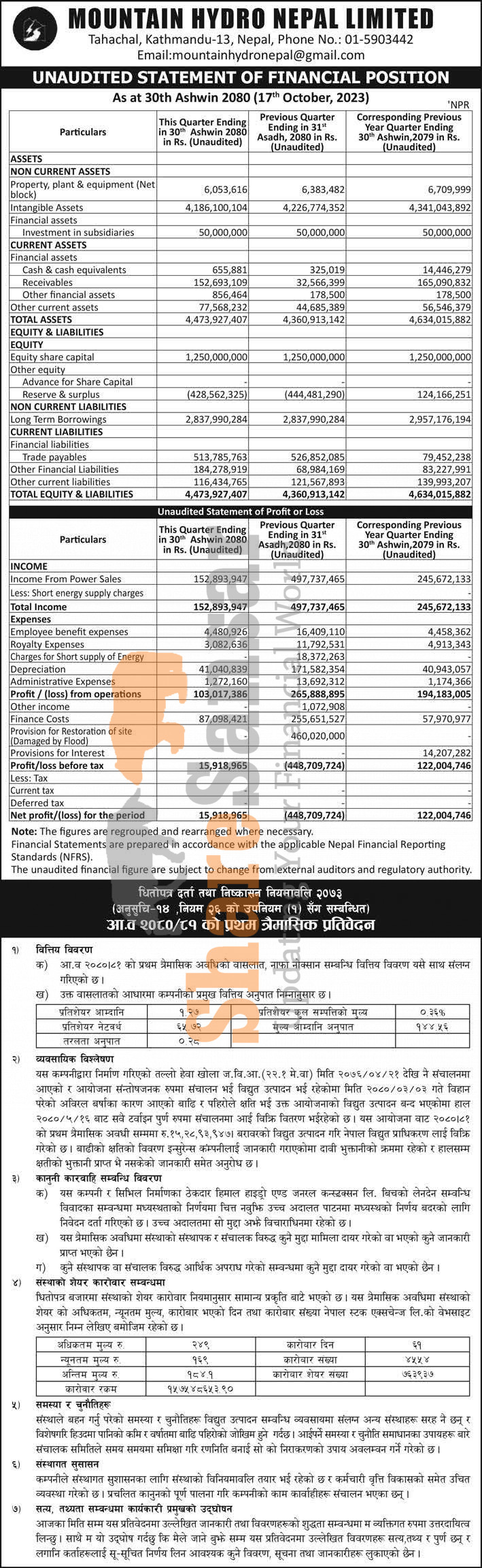 Mountain Hydro Nepal Limited has posted a net profit of Rs 15.91 million during the 1st quarter of the fiscal year 2080/81.