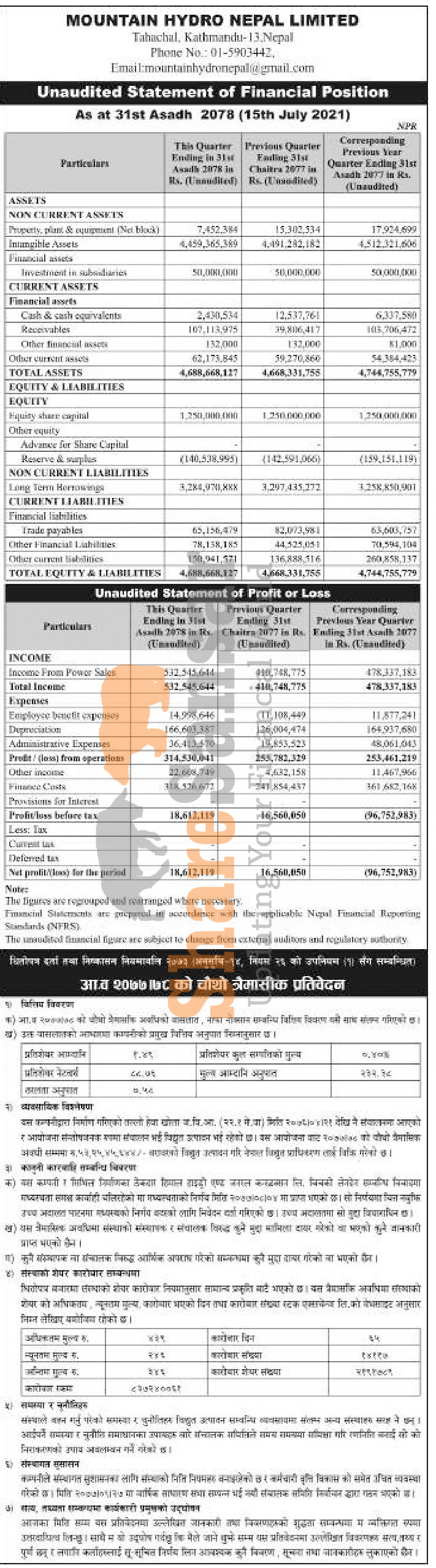Mountain Hydro Nepal Limited has posted a net profit of Rs 18.61 million and published its 4th quarter company analysis of the fiscal year 2077/78.