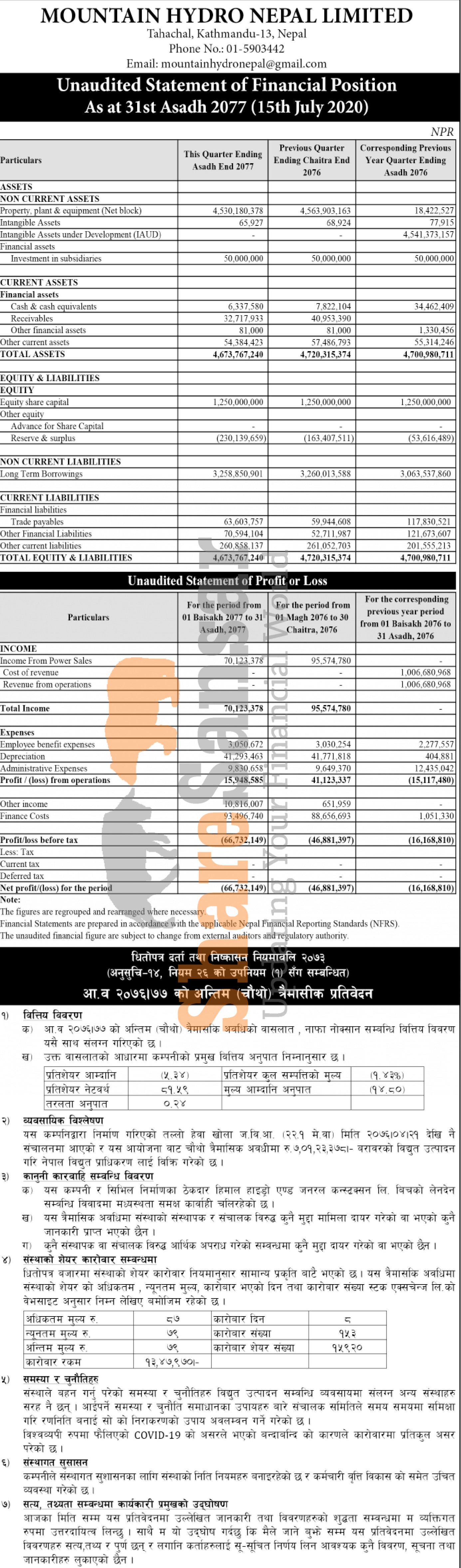 Mountain Hydro Nepal Limited has posted a net profit of Rs 66.73 million and published its 4th quarter company analysis of the fiscal year 2076/77.