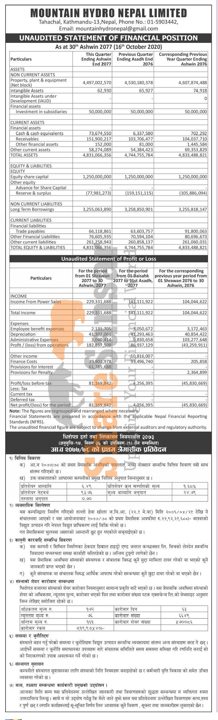 Mountain Hydro Nepal Limited has posted a net profit of Rs 81.16 million and published its 1st quarter company analysis of the fiscal year 2077/78.