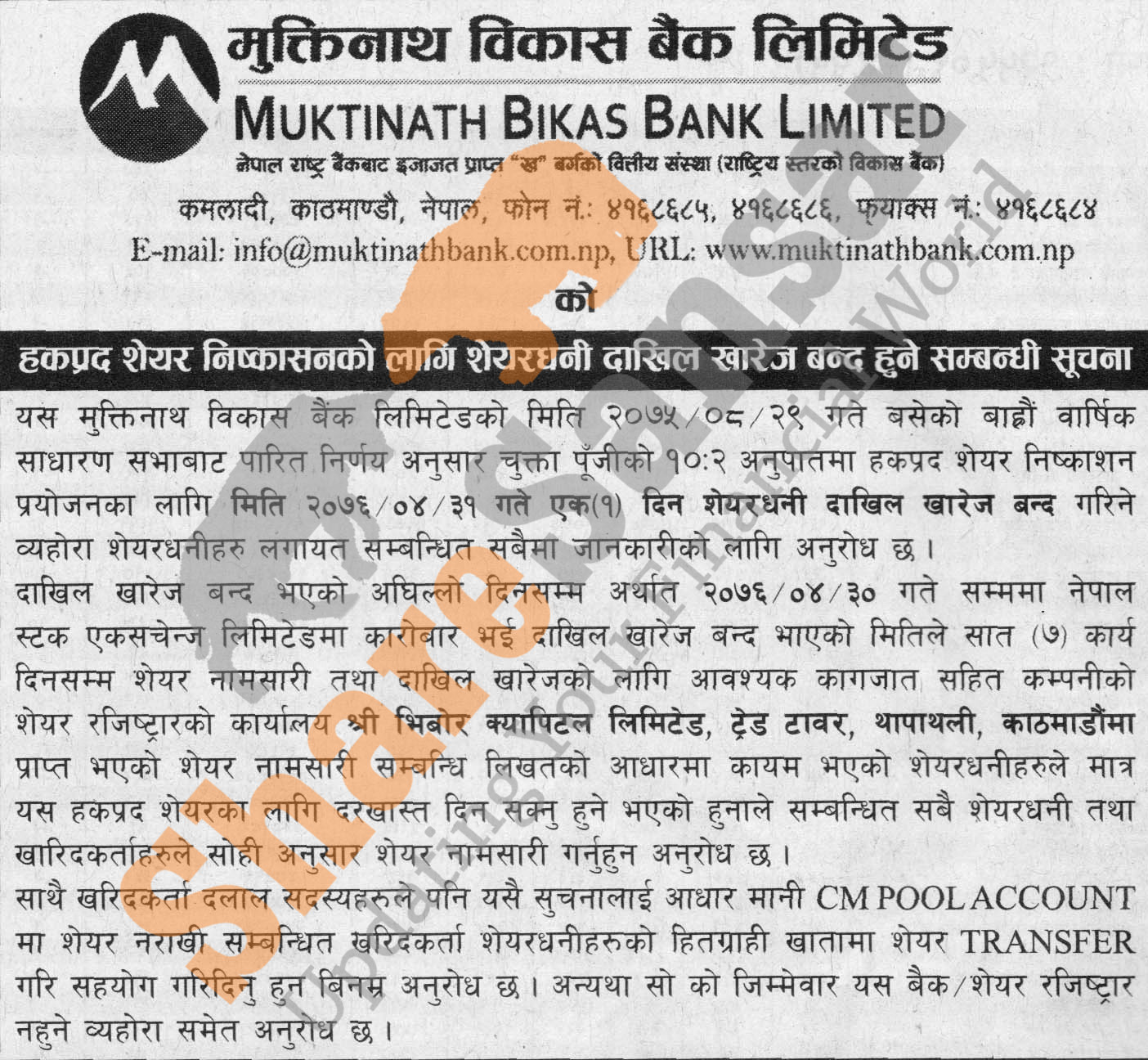 Muktinath Bikas Bank Limited has announced a book closure date for its upcoming 10:2 ratio right share on 31st Shrawan, 2076.