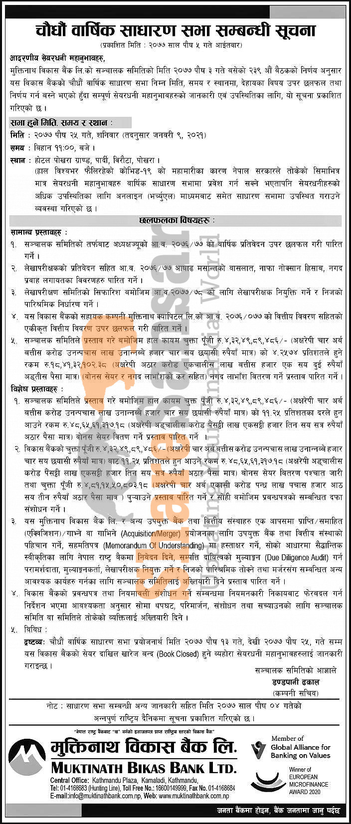 Muktinath Bikas Bank Limited has announced its 14th AGM going to be held on 25th Poush, 2077.
