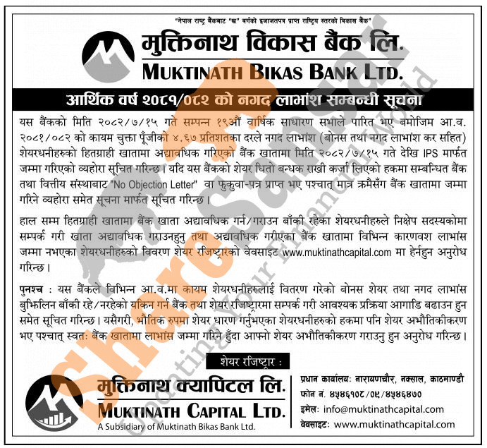 Muktinath Bikas Bank Limited has distributed 4.67% cash dividend directly to the bank accounts of its shareholders on 15th Kartik, 2082.