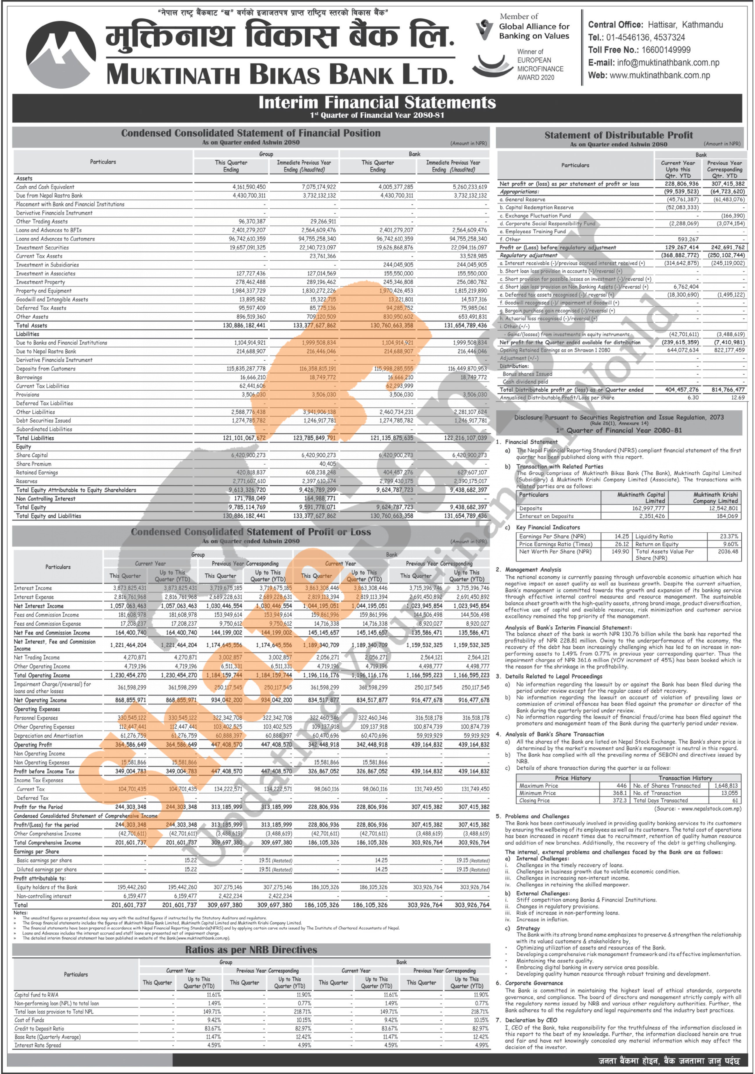 Muktinath Bikas Bank Limited has posted a net profit of Rs 228.80 million and published its 1st quarter company analysis of the fiscal year 2080/81.