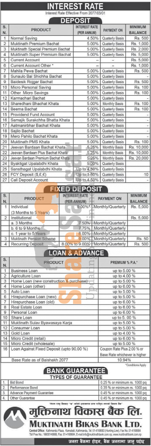 Muktinath Bikas Bank Limited has published a notice regarding new interest rate and its effective from 1st Ashad, 2077.