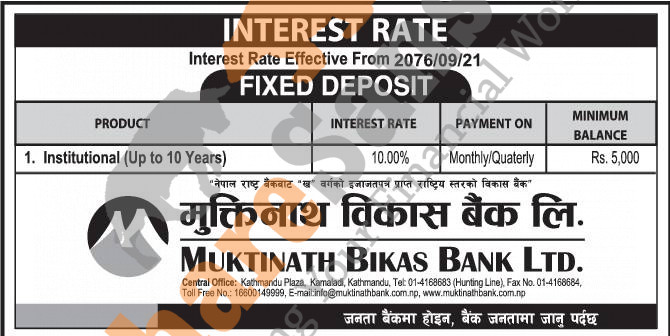 Muktinath Bikas Bank Limited has published a notice regarding new interest rate and its effective from 21st Poush, 2076.