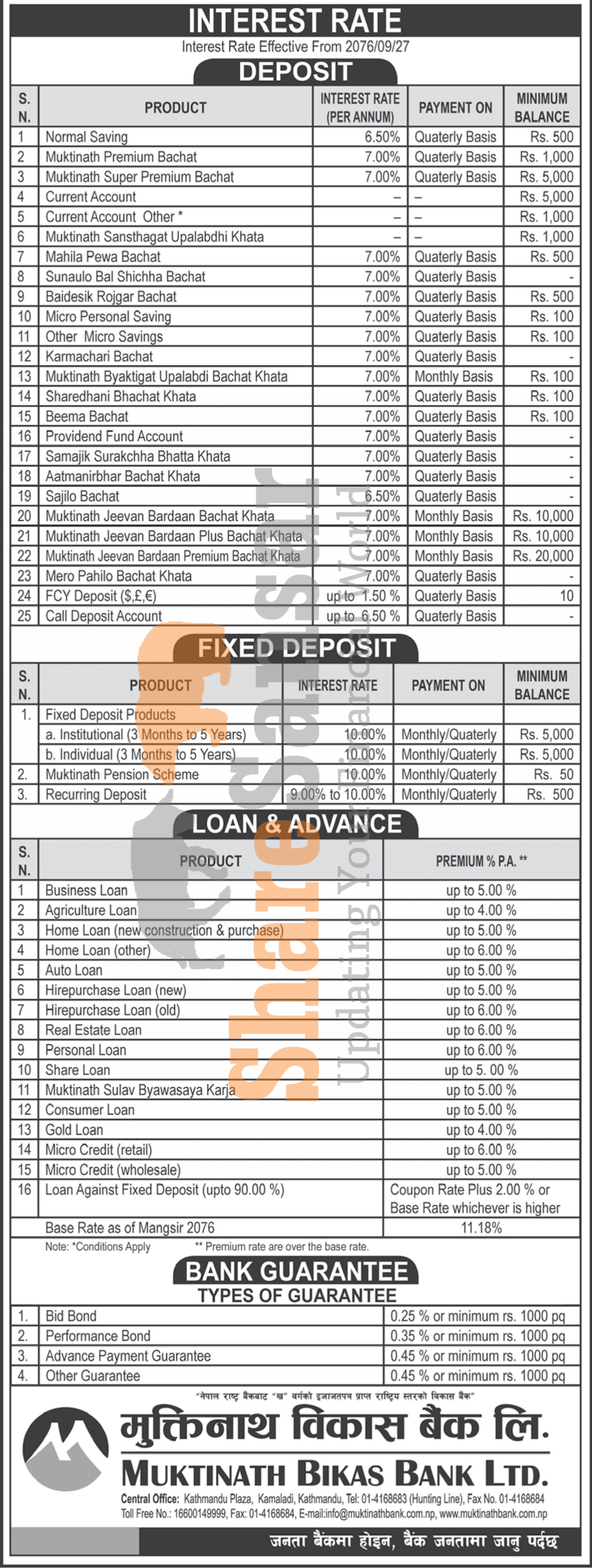 Muktinath Bikas Bank Limited has published a notice regarding new interest rate and its effective from 27th Poush, 2076.